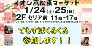 「てらすぽくるくる 」の情報を追加しました!! 2026 1/19 てらすぽくるくる 2025年8月21日2026年1月19日 準備を進めてまいりました就労継続支援B型事業所 てらすぽくるくるが開所いたしました!! てらすぽくるくる URLをコピーしました! URLをコピーしました! 第7回 ダンス教室 開催 決定しました!! てらすぽくるくる in イオン高松東マーケット 2026.1.24 関連記事 2026.2.7(土) バレンタインマルシェ に参加します!! 2026年1月22日 てらすぽくるくる 見学会 開催!! 令和8年2月14日(土) 2026年1月20日 羊毛フェルト ~なかまがふえました~ 2026年1月20日 てらすぽくるくる in イオン高松東マーケット 2026.1.24 2026年1月20日